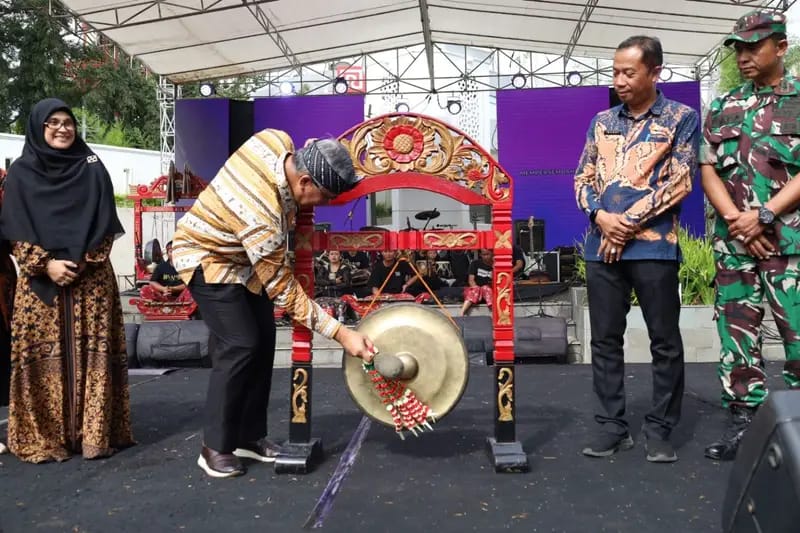 PJ. Walikota Cimahi Dicky Saromi saat akan membuka Pekan Kebudayaan Kota Cimahi 2024 didampingi Asisten I bidang Pemerintahan dan Kesejahteraan rakyat Mardi Santoso (kiri) baju batik biru
