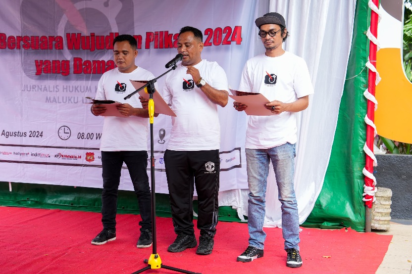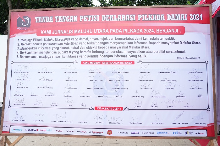 Bertempat di Taman Nukila Ternate, insan pers yang diinisiasi oleh Jurnalis Hukum dan Kriminal Maluku Utara melaksanakan kegiatan Deklarasi Damai dan Penandatanganan Petisi sebagai wujud komitmen bersama bahwa insan pers mendukung penuh pelaksanaan Pilkada Maluku 2024 yang aman dan damai. Minggu (18/08/2024).