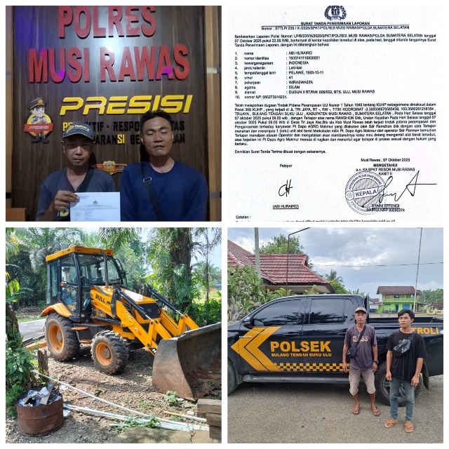 Telah melaporkan dugaan tindakan pidana perampasan UU no 1 tahun 1946 tentang KUHP sebagaimana dimaksud dalam pasal 368 KUHP, yang terjadi di JL TRI Jaya ,Rt- Rw – titik koordinat – 3.388338670585438,103.358026126154.TRI Jaya,Bulang Tengah Suku Ulu, Kabupaten Musi Rawas Sumatera Selatan,Pada hari Selasa Tanggal 07, Oktober, 2025, Pukul 09:00 WIB, dengan terlapor atas nama berinisial Rmd DKK, uraian kejadian pada hari Selasa tanggal 07, Oktober,2025, pukul 09:00 WIB di Desa Tri jaya kecamatan BTS ulu Kabupaten Musi Rawas telah terjadi tindakan pidana perampasan dan pengacaman terhadap karyawan PT Dapo AGRO makmur yang dilakukan oleh saudara Rmd dkk dengan cara terlapor menahan dan merampas satu ( 1 ) alat berat bhekoloder milik PT Dapo AGRO makmur dari operator saudara Pariaman, kemudian terlapor menelpon atasan operator dan mengatakan akan membunuhnya kalau mau datang mengambil alat berat tersebut.