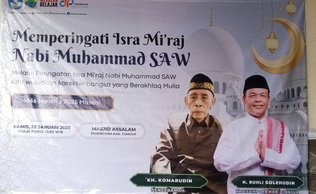 Cianjur, http://medianuansasinarnews.com- Peringatan Isra Miraj Nabi Muhammad SAW 1446 dengan tema “Melalui Peringatan Isra’ Mi’raj Nabi Muhammad kita Wujudkan karakter bangsa yang berahlaq Mulia” Acara berlangsung di mesjid Assalam Disdikpora (30/01/2025) jam 13.00 WIB.