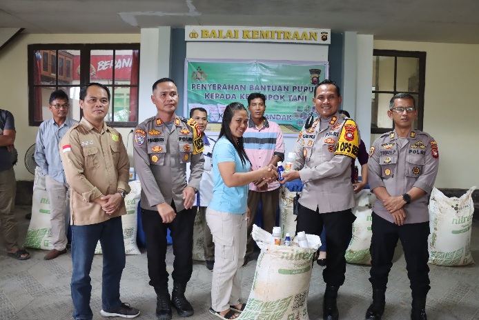 Landak, http://medianuansasinarnews.com- Polres Landak – Polda Kalbar – Sie Humas. Dalam rangka mendukung Program Ketahanan Pangan Nasional, Kapolres Landak, AKBP Siswo Dwi Nugroho, S.H., S.I.K., melaksanakan kegiatan penyerahan bantuan pupuk jenis urea serta obat-obatan pestisida dan fungisida kepada kelompok tani. Acara ini berlangsung di Balai Kemitraan Polsek Ngabang, Dusun Pulau Bendu, Desa Hilir Tengah, Kecamatan Ngabang, Kabupaten Landak.