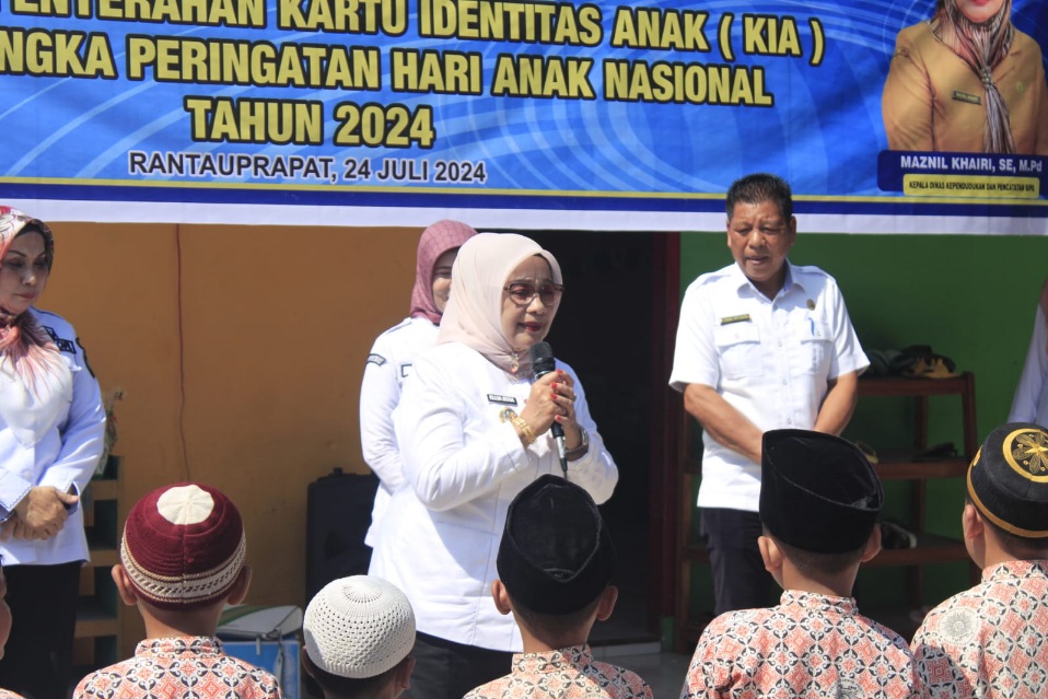 Labuhanbatu/Sumut, http://medianuansasinarnews.com- Dalam rangka Hari Anak Nasional, Pelaksana Tugas (Plt) Bupati Labuhanbatu Hj. Ellya Rosa Siregar S.Pd., M.M., menyerahkan Kartu Identitas Anak (KIA) bagi murid TK ABBA Aek Paing Bawah, Jalan Pelita lV, Kelurahan Aek Paing, Kecamatan Rantau Utara. Rabu (24/07/2024).