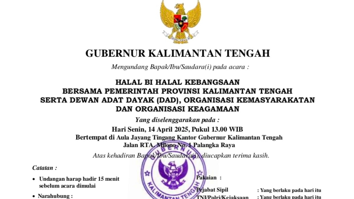 PALANGKA RAYA, http://medianuansasinarnews.com- Pemeritah Provinsi (Pemprov) Kalimantan Tengah mengadakan acara Halal Bi Halal Kebangsaan yang akan berlangsung di Aula Jaya Tingang (AJT), Kantor Gubernur setempat, pada Senin besok (14/04/2025). Acara tersebut turut mengundang Ikatan Media Online (IMO) Kalteng.