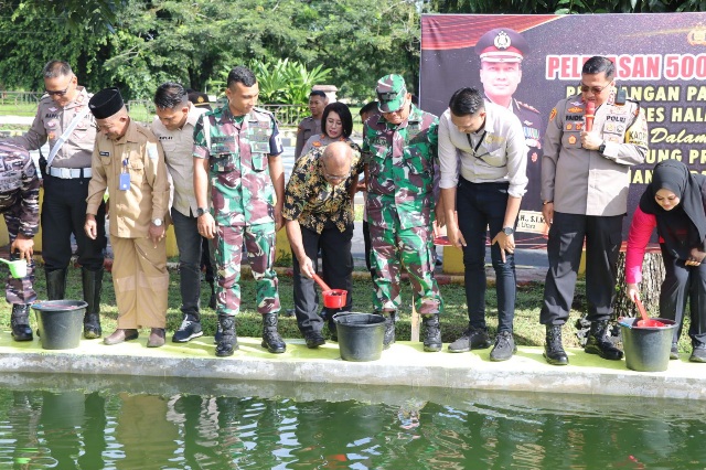 Halut, http://medianuansasinarnews.com- Upaya untuk mendukung program Asta Cita Presiden Prabowo Subianto dalam bidang ketahanan pangan, Kapolres Halmahera Utara AKBP Faidil Zikri, S.H., S.I.K., bersama Forkopimda dan Kepala Dinas dan Jawatan Halmahera Utara, menebar 5000 benih ikan nila di kolam Polres Halmahera Utara, Maluku Utara. Selasa (25/02/2025).