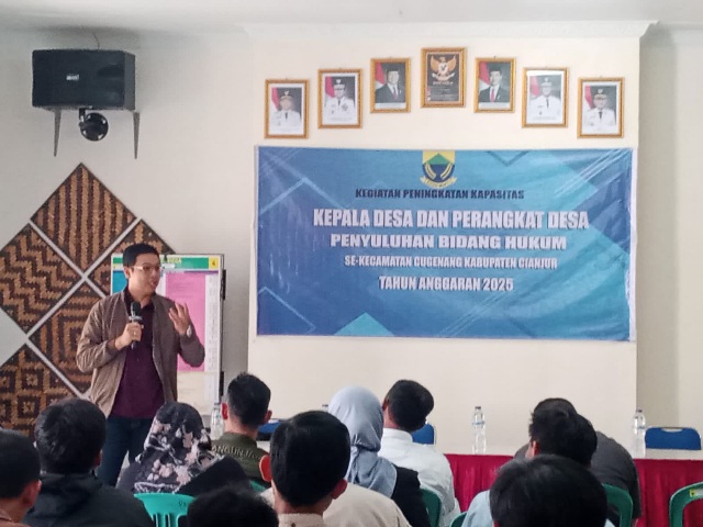 Cianjur, http://medianuansasinarnews.com- Kegiatan peningkatan kapasitas Kepala Desa melalui penyuluhan hukum se-Kecamatan Cugenang Kabupaten Cianjur, bertujuan untuk meningkatkan pengetahuan dan pemahaman hukum bagi kepala Desa dan perangkat Desa dalam menjalankan tugas serta fungsinya di Desa, Kegiatan tersebut berlangsung di Aula Desa padaluyu Kecamatan Cugenang Kabupaten Cianjur. Selasa (29/04/2025)