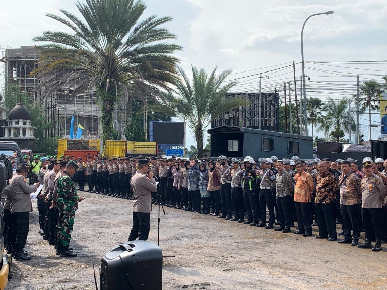 Apel kesiapan pengamanan dipimpin oleh Kabagops Polres Bogor, Kompol Bayu Tri Nugraha Hidayat, S.E., S.I.K., M.M., di halaman Masjid Harakatul Jannah, Gadog, Kecamatan Megamendung, Kabupaten Bogor.
