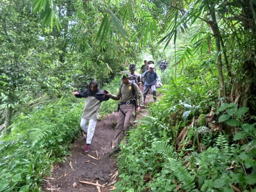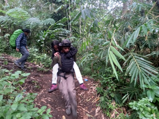 Ternate, http://medianuansasinarnews.com- Personel Satuan Brimob Polda Maluku Utara bersama personel Resimen Pelopor Pasukan Brimob III wilayah Maluku Utara yang tergabung dalam _Tim Fere Kie_ Sat Brimob Polda Maluku Utara mengevakuasi seorang pendaki gunung Gamalama yang mengalami kelelahan saat pendakian.