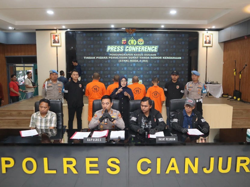 “Kemudian dengan penyelidikan mendalam, tentunya dari Satreskrim Polres Cianjur mengamankan sejumlah orang beserta barang bukti berupa STNK dan beberapa unit kendaraan roda empat yang menggunakan STNK yang diduga palsu,” ucap Kapolres Cianjur.