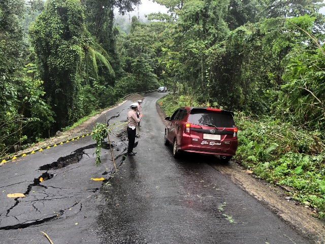 Hujan deras yang mengguyur wilayah Halmahera Timur menyebabkan lapisan tanah di sekitar jalan menjadi labil, mengingat lokasi tersebut merupakan daerah pegunungan, hal ini mengakibatkan Penurunan Permukaan tanah atau lapisan Aspal turun sehingga Jalan Aspal rusak parah.