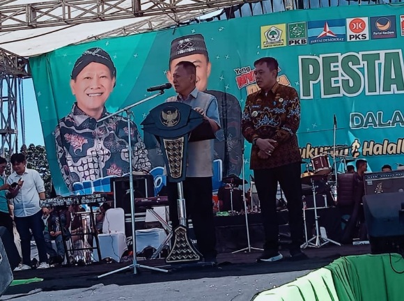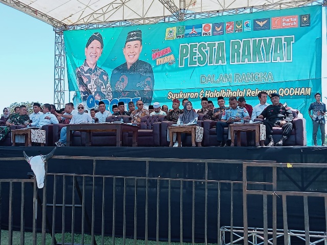 “Dengan rasa Syukur kita panjatkan kepada Allah (SWT) Tuhan Yang Maha Esa, kita bisa sama-sama hadir dalam acara Pesta Rakyat ini dengan keadaan sehat Walafiat. Kita mengadakan acara Pesta Rakyat semua ini atas partisipasi tim relawan (QODHAM) kita juga menyembelih (5) ekor kerbau, itu menandakan kita selalu patuh ibadah Sholat pardhu (5) waktu untuk itu mari kita selalu taat dalam Sholat Pardhu (5) waktu berjama’ah di masjid,” ucap Bupati