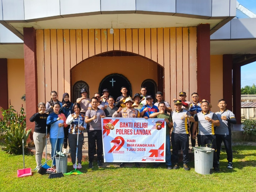 Landak, http://medianuansasinarnews.com- Polres Landak – Polda Kalbar – Sie Humas. Dalam rangka menyambut Hari Bhayangkara Ke-79, Polres Landak melaksanakan kegiatan Bakti Religi yang menyasar empat gereja yang ada di wilayah Kecamatan Ngabang, Kabupaten Landak. Kegiatan ini berlangsung penuh semangat dan kebersamaan pada hari Sabtu pagi (14/06/2025), dengan melibatkan personel Polres Landak, pengurus gereja, serta masyarakat sekitar.