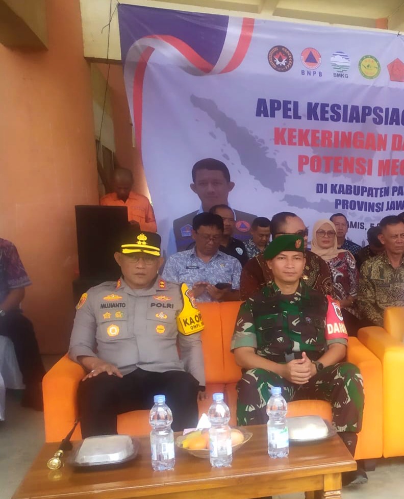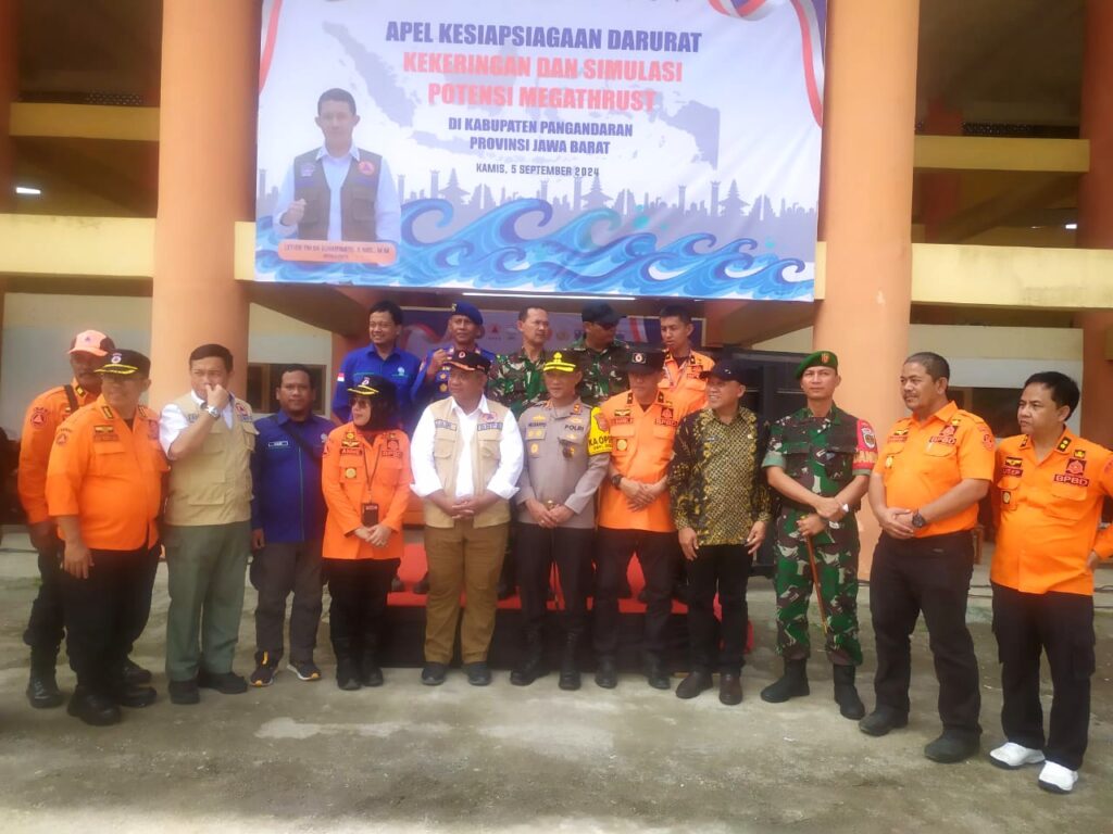 Pangandaran, http://medianuansasinarnews.com- Apel kesiap siagaan darurat kekeringan dan simulasi potensi megathrust, turut menghadiri Dandim 0625 Pangandaran Letkol Inf. Indra Mardianto Subroto M.I.P., beserta jajaran dan Kapolres Pangandaran AKBP. Mujianto, S.I.K., M.H., beserta jajaran, jajaran Pemerintah Daerah Kabupaten Pangandaran. Dalam simulasi melibatkan TNI/Polri, seluruh jajaran BPBD dan Tagana juga melibatkan unsur masyarakat seputar lokasi, bertempat Gedung Smelter Evakuasi Sementara BPBD Kabupaten Pangandaran, tepatnya di kompleks Pasar Wisata, Dusun Karangsari, Desa Pananjung, Kecamatan Pangandaran, Kabupaten Pangandaran, Provinsi Jawa Barat, (05/09/2024)