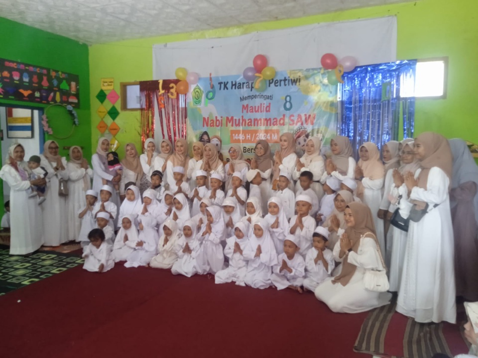 Maulid nabi besar Muhammad SAW di TK Harapan Pertiwi. Acara dimulai pada pukul 09.00 WIB, berlangsung sangat meriah dan penuh rasa syukur kehadirat Tuhan Yang Maha Esa, riang bersuka rianya anak-anak TK Harapan Pertiwi, menambah kebahagiaan acara Maulid tersebut.