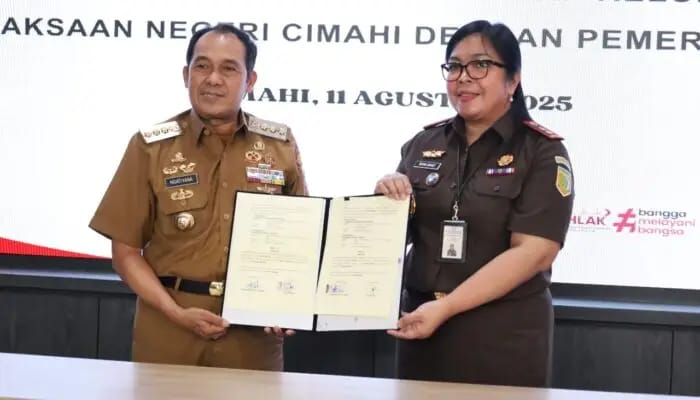 Cimahi, http://medianuansasinarnews.com- Walikota Cimahi Ngatiyana bersama Kejaksaan Negeri (Kejari) Cimahi yang diketuai oleh Nurintan MNO Sirait, S.H., M.H., menandatangani Memorandum of Understanding (MoU) pembentukan Rumah Restorative Justice di seluruh Kelurahan se-Kota Cimahi. Penandatanganan berlangsung di Aula Kejari Cimahi, Senin (11/08/2025),